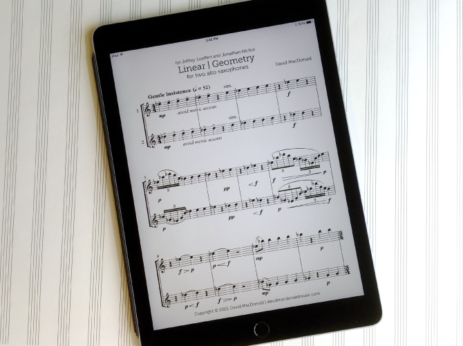 After having written quite a few heavy, aggressive works for saxophones, I wanted to express some different kinds of ideas on the instrument. Two players work together and against one another with varying degrees of precision: sometimes reflecting, other times reacting.
